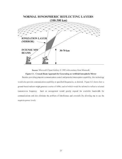 Ecco un documento governativo fondamentale ed incontrovertibile, pubblicato negli USA il 17 giugno 1996, basato sul brevetto di Eastlund del 1987. Un consiglio di lettura: Ionospheric Modification and Its Potential To Enhance or Degrade The Performance of Military Systems (Nato, Agard, 1990, pagine 490).